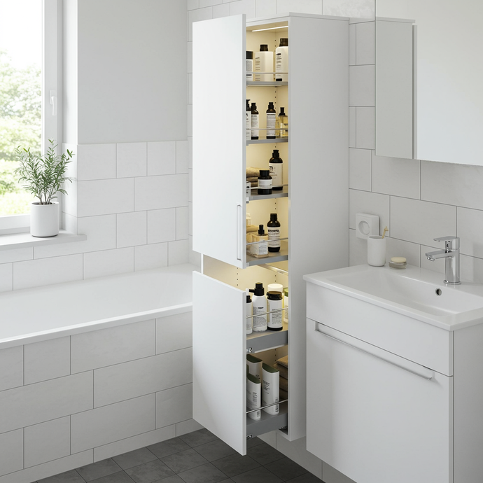 ארון אמבטיה כולל סל כביסה מובנה ומדפי אחסון