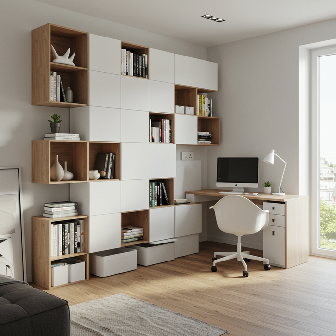ספרייה מעוצבת בצבע לבן לשדרוג המראה בסלון