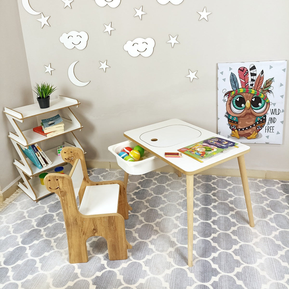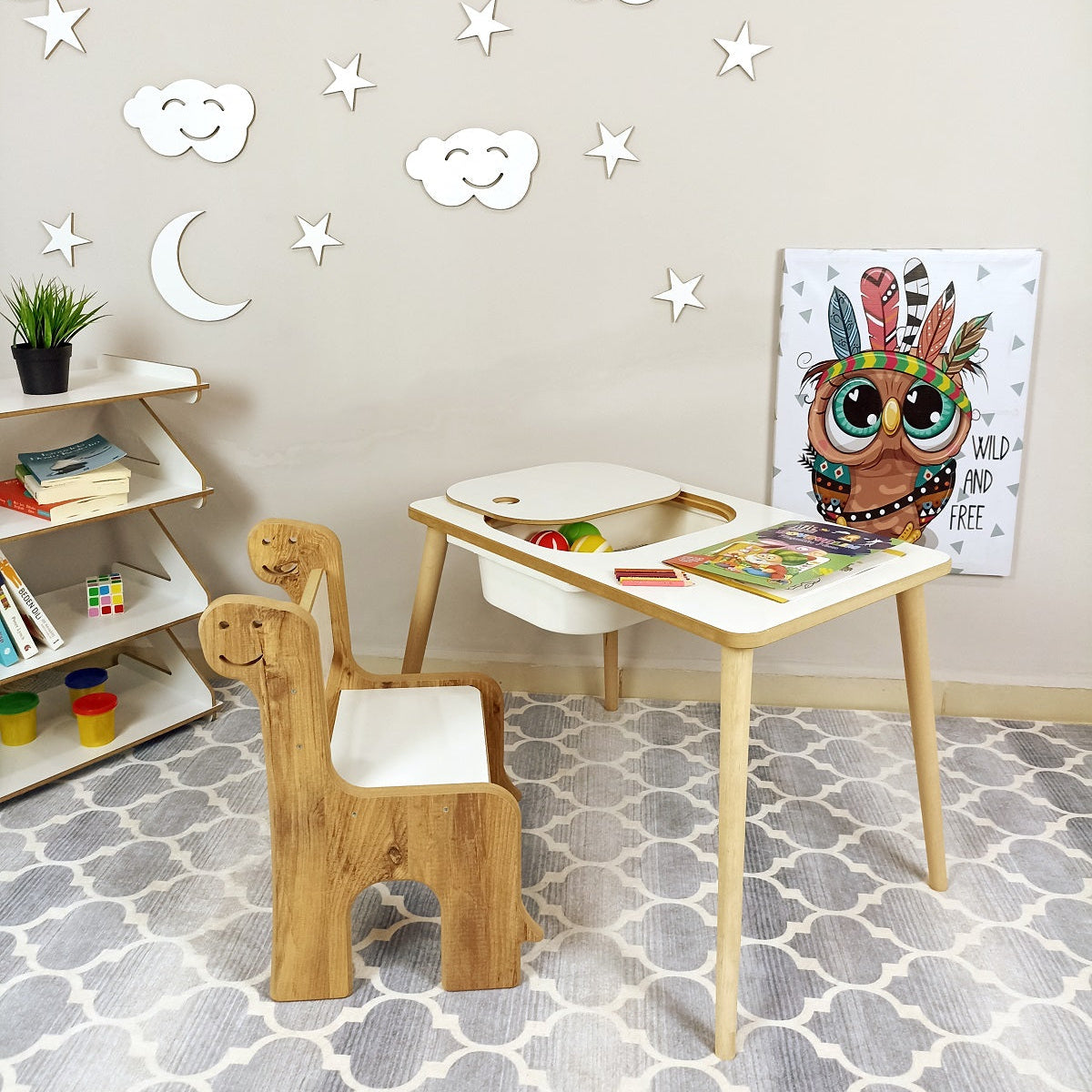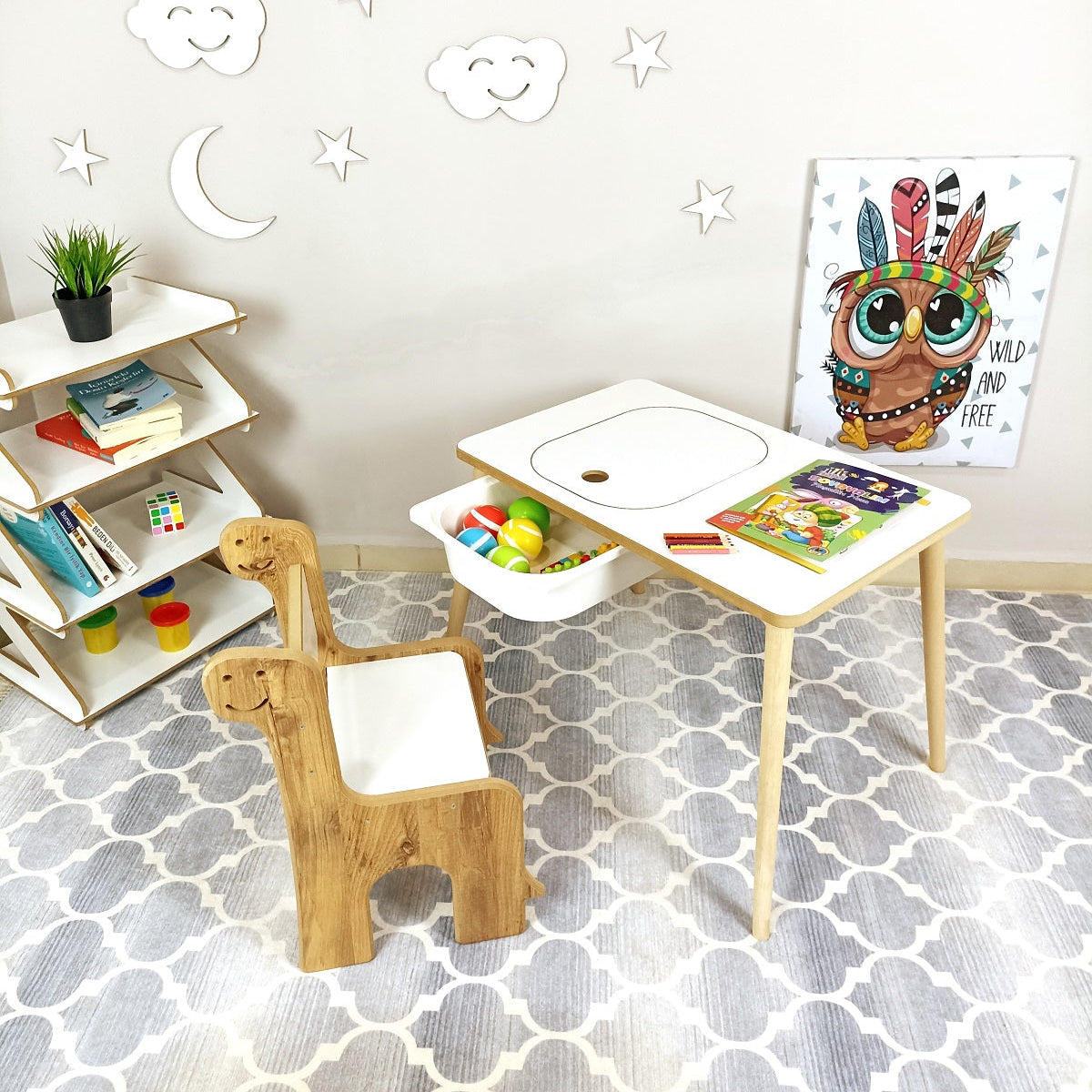 השולחן מלבני ובעל 2 מגירות אחסון לאחסון כלי הכתיבה המאפשרים גישה נוחה ועצמאות לילדים.