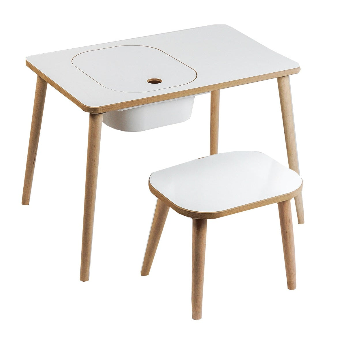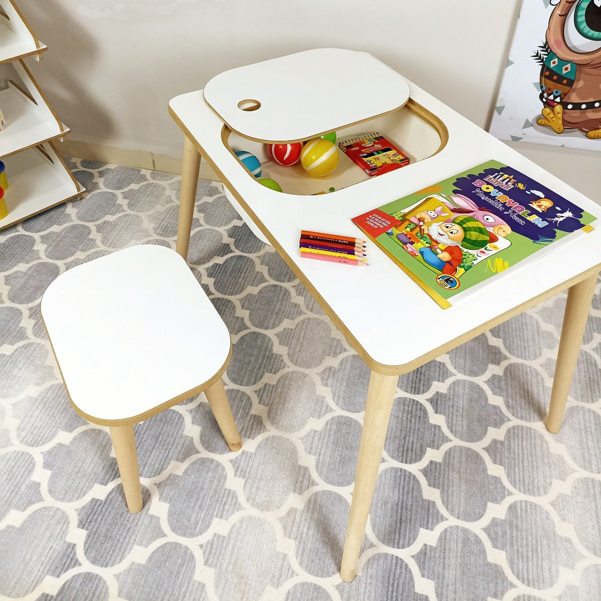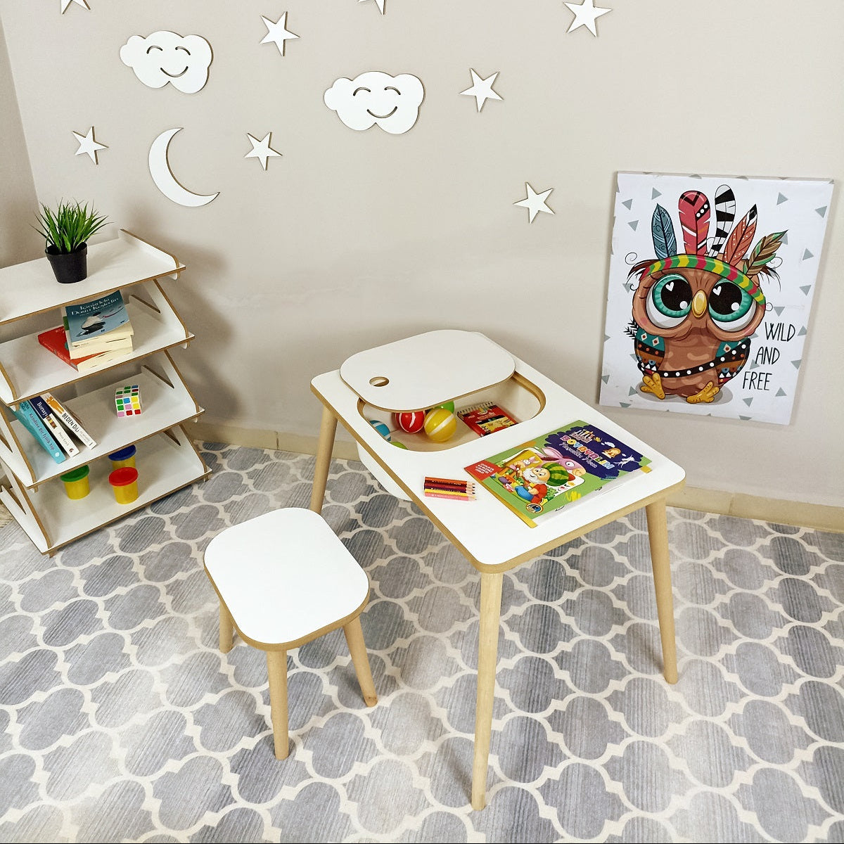 השולחן מלבני ובעל מגירה לאחסון כלי הכתיבה המאפשרים גישה נוחה ועצמאות לילדים.