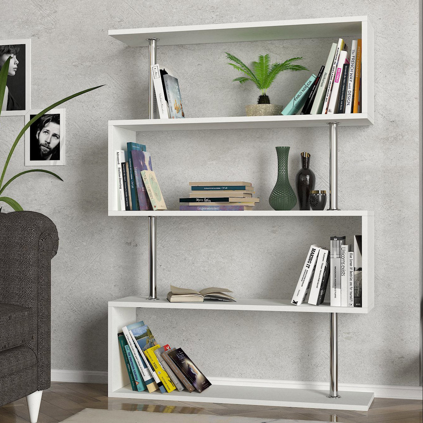 ספרייה מעוצבת בצבע לבן, בעיצוב ייחודי ומרשים. לשדרוג המראה בסלון או בכל חדר בבית או במשרד.