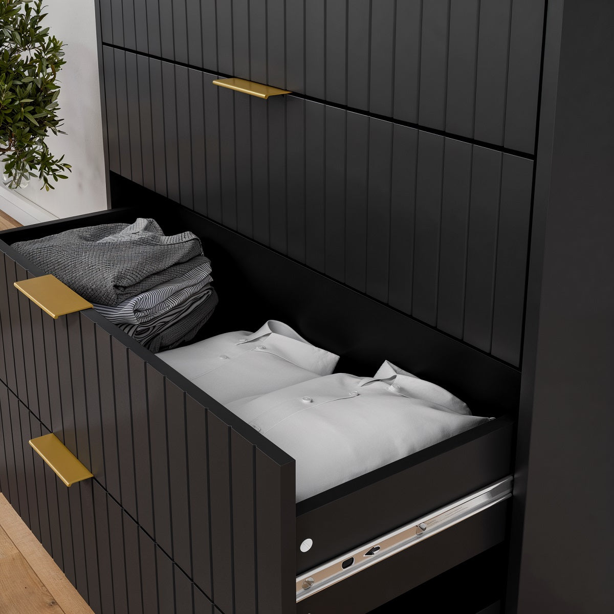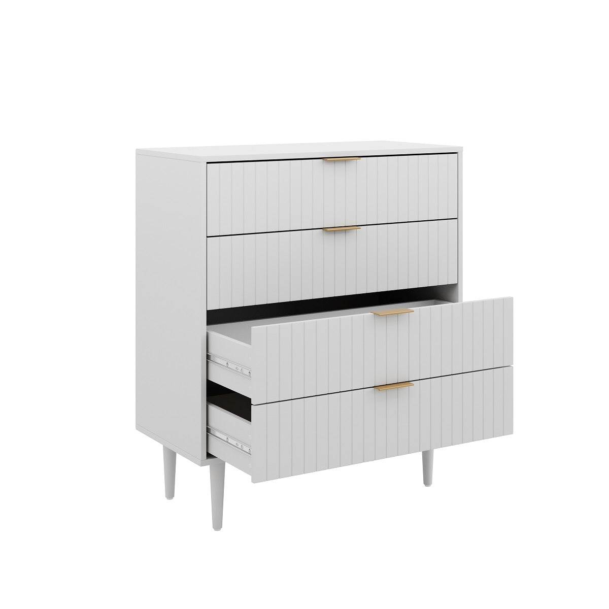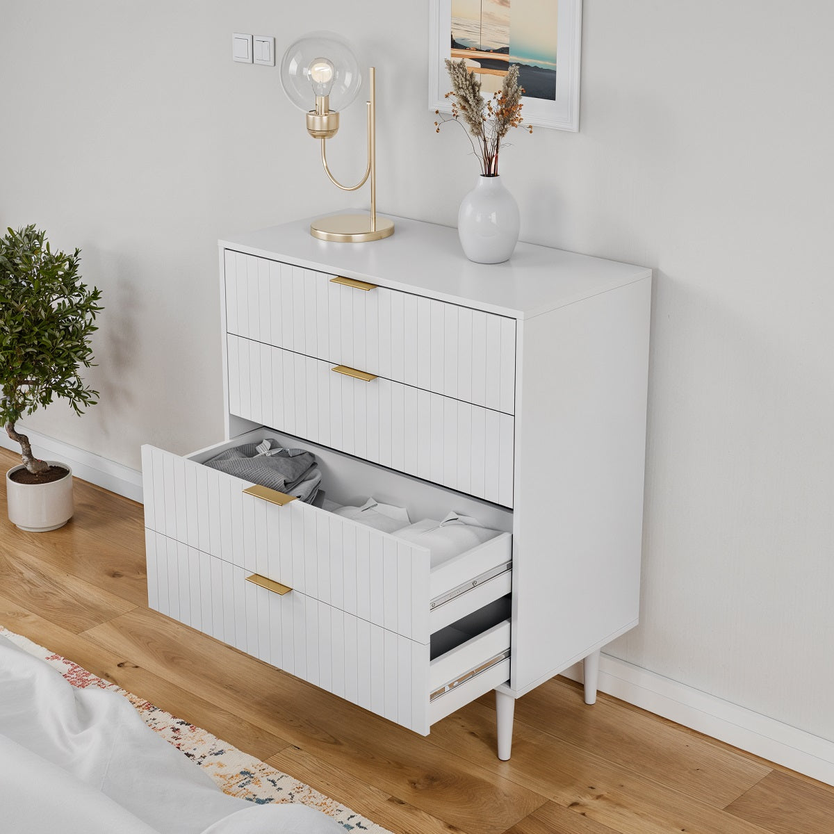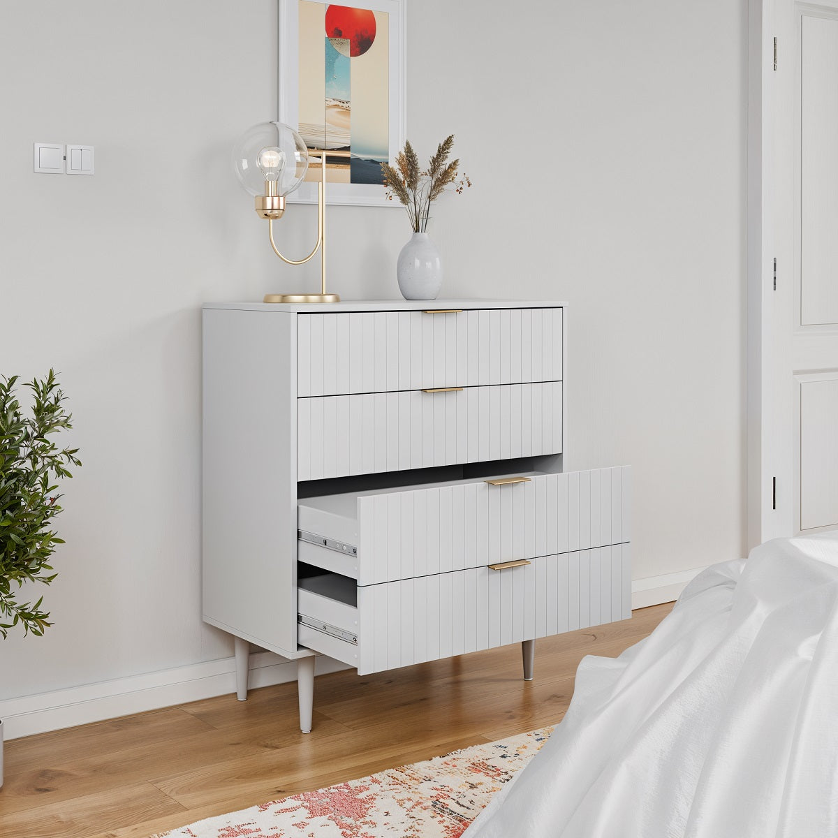 הקומודה מכילה ארבע מגירות מרווחות עם ידיות אלגנטיות ומסילות נוחות לפתיחה חלקה