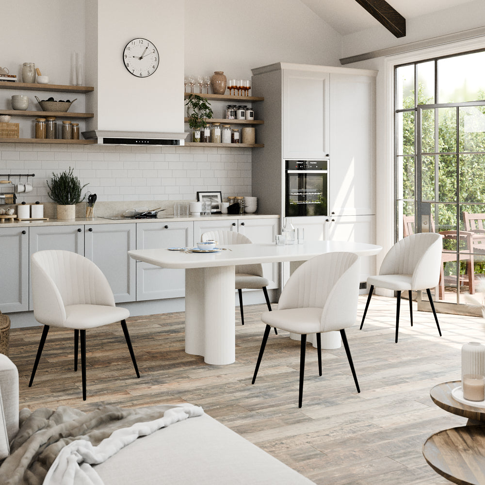 הכירו את כיסאות פינת האוכל שישדרגו לכם את חוויית הארוחות : שילוב מושלם של נוחות עיצוב מודרני בבד בוקלה יוקרתי בקווים נקיים ואלגנטיים בסגנון מודרני ויוקרתי