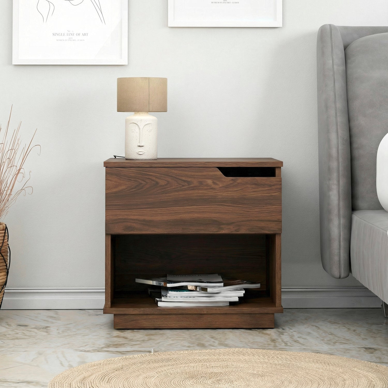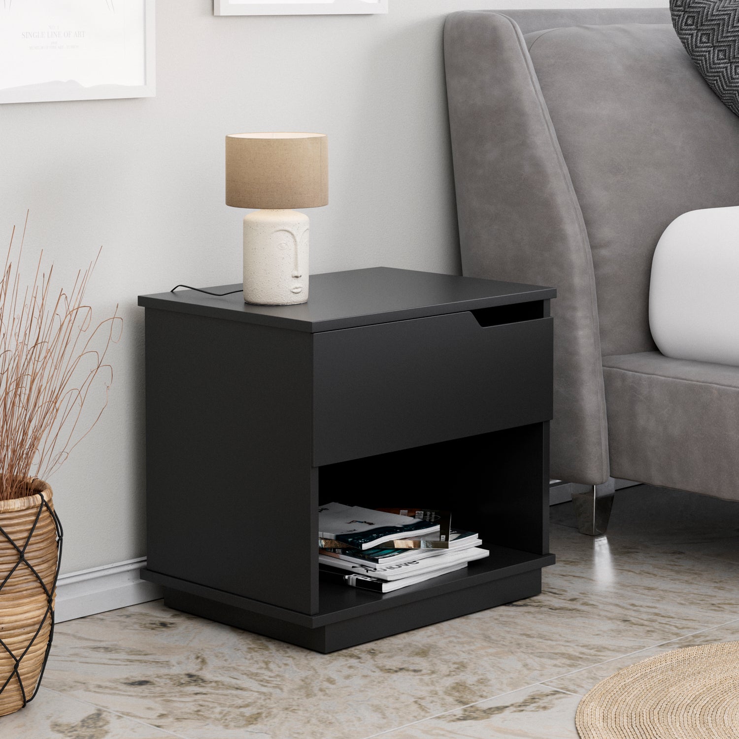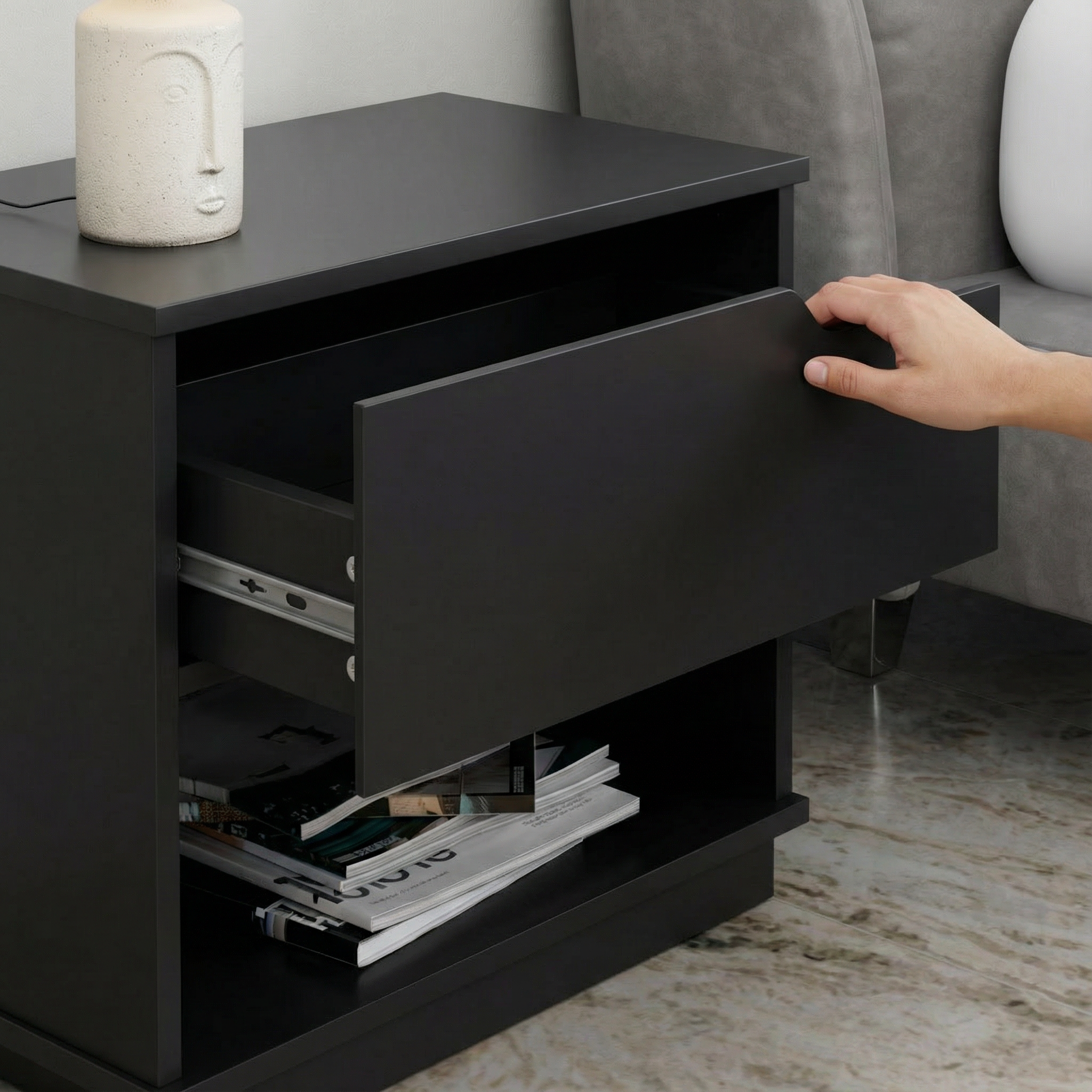 משטח עליון למנורה ספר או כוס קפה בבוקר . מגירה לאחסון ותא אחסון פתוח לכל הדברים שצריכים להיות בהישג יד.