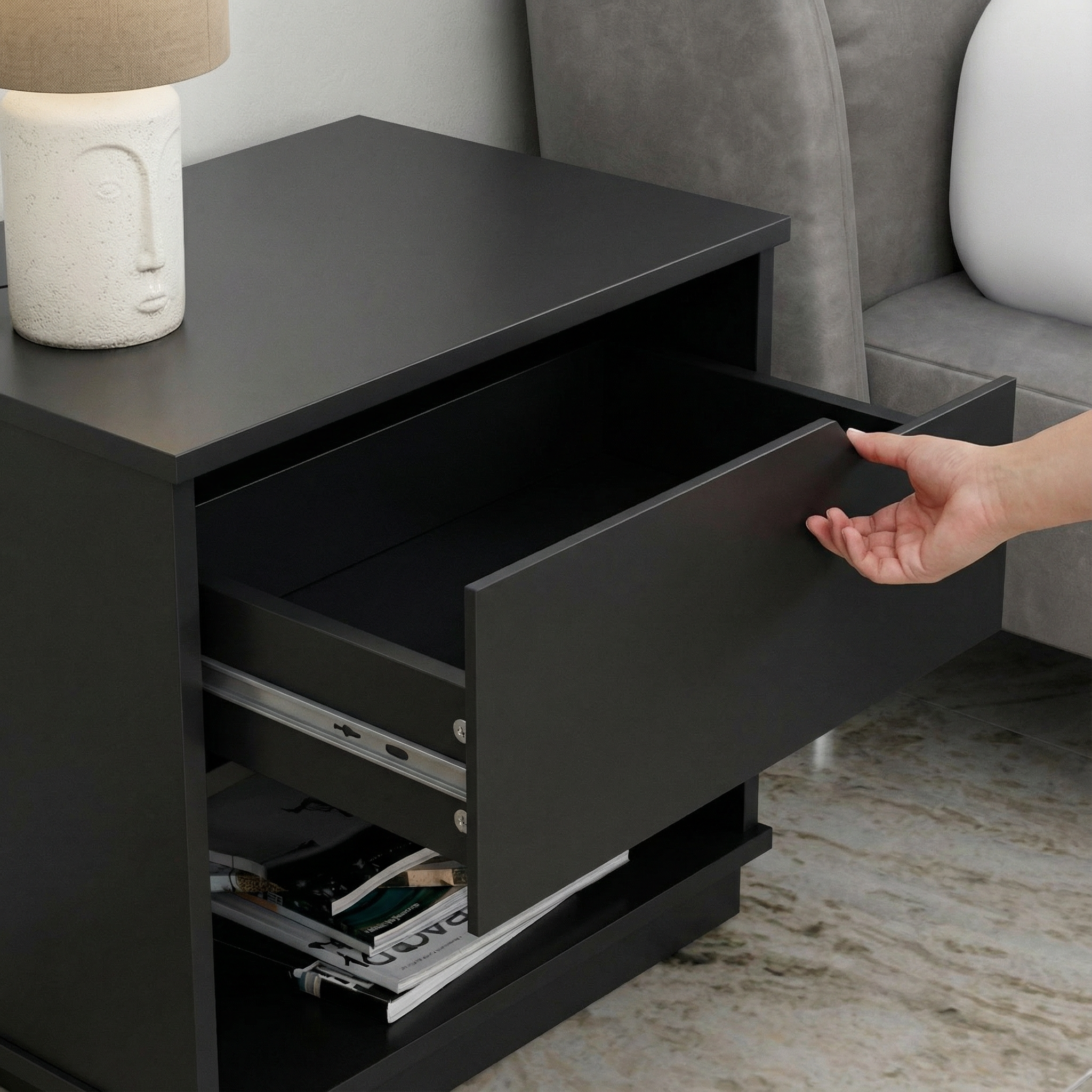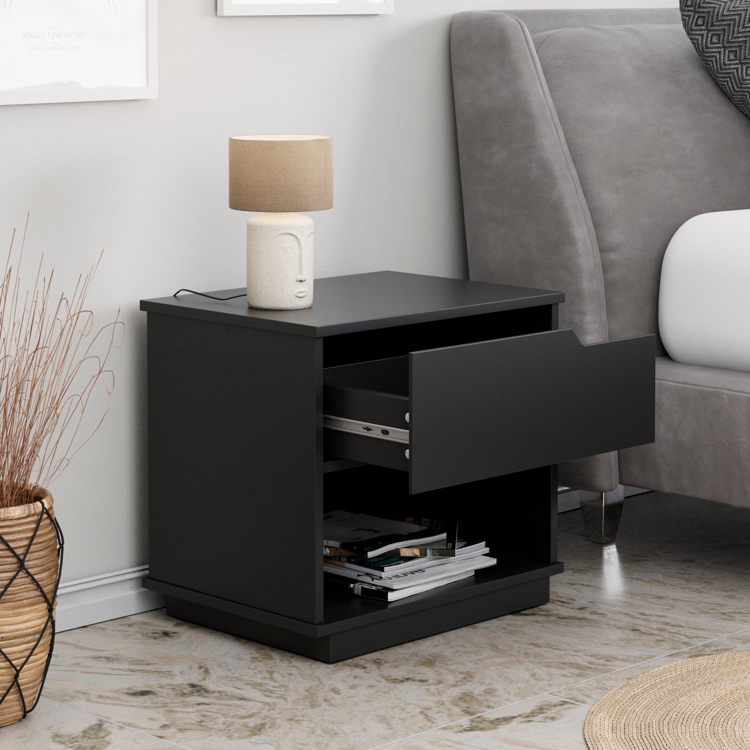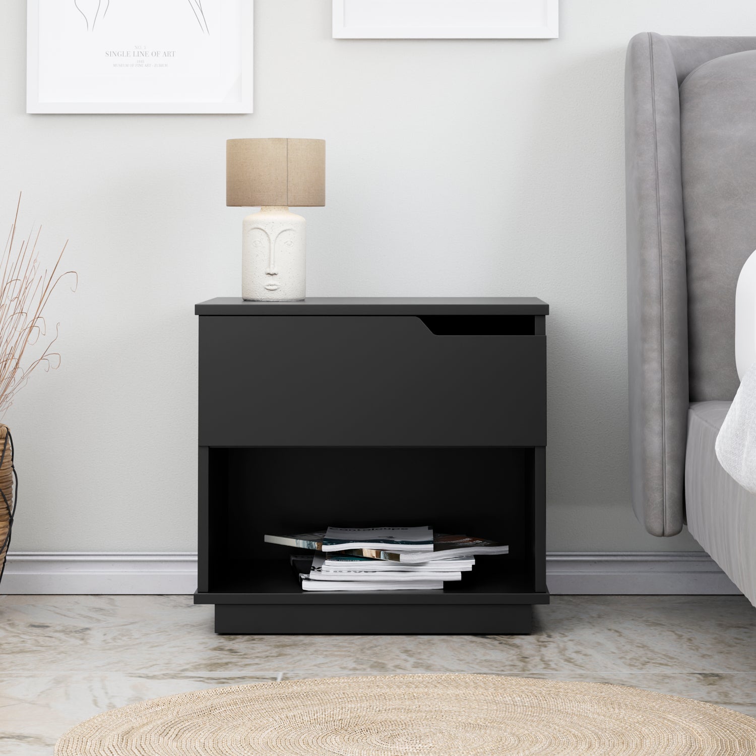 משטח עליון למנורה ספר או כוס קפה בבוקר . מגירה לאחסון ותא אחסון פתוח לכל הדברים שצריכים להיות בהישג יד.
